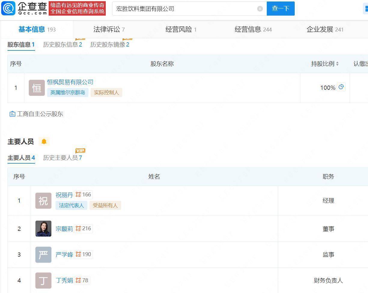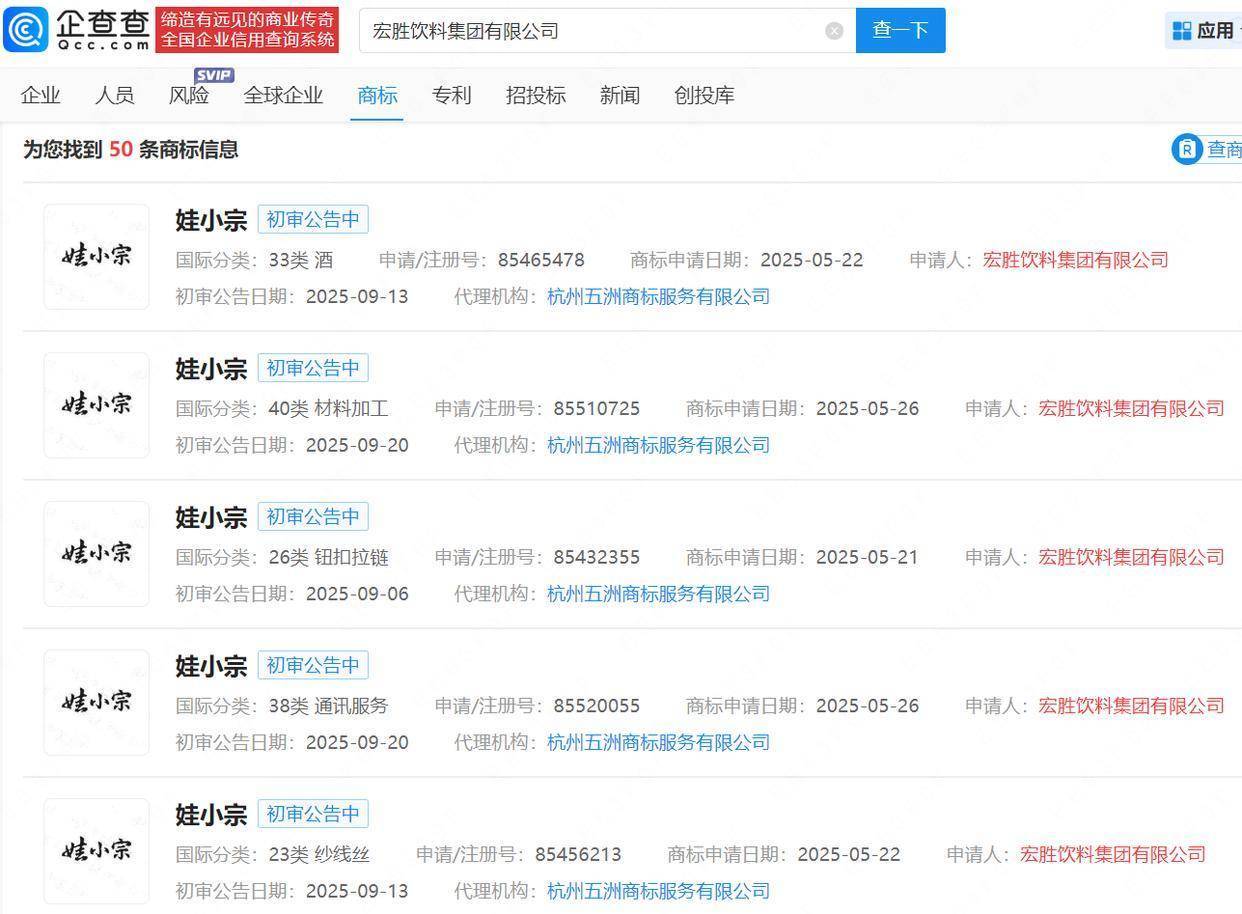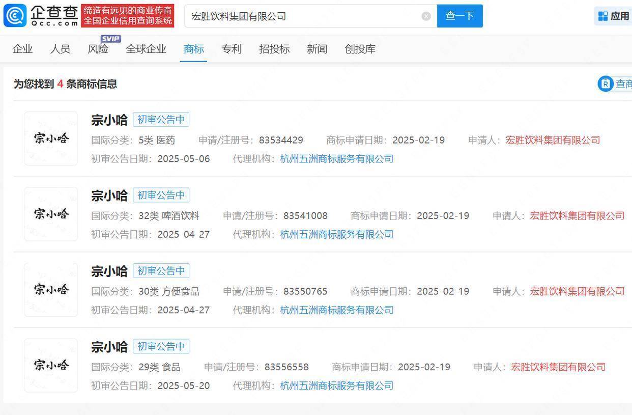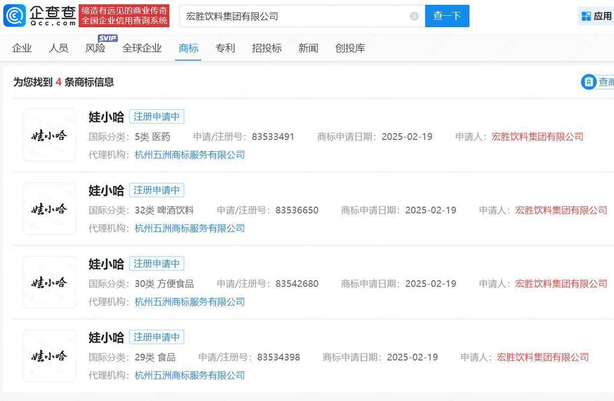 企查查显示,今年2月以来,宗馥莉任董事的宏胜饮料集团有限公司申请注册多枚“娃小宗”、“娃小哈”、“宗小哈”商标,国际分类涉及啤酒饮料、方便食品、材料加工等。目前“娃小哈”商标状态在注册申请中,“娃小宗”、“宗小哈”商标处于初审公告状态。(信网记者)