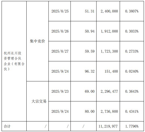 近日,公司收到长川投资出具的《关于股份减持情况的告知函》,获悉其于2025年8月25日至2025年9月24日通过集中竞价及大宗交易方式合计减持其持有的公司股份数量比例已达到公司总股本的1.00%(以截至2025年9月24日公司总股本630,465,854股为基数计算,下同),且本次减持计划已实施完成。截至该告知函出具之日,长川投资累计减持其所持有的公司股份合计11,219,977股,占公司总股本的1.7796%。长川投资本次减持股份总数未超过减持计划约定的股数。